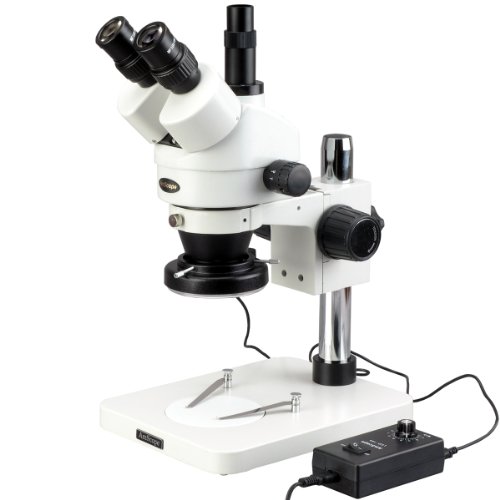 Sturdy all-metal pillar stand with tension-adjustable focusing.144-LED ring light with 4 light zones and individual control.The trinocular port uses the third port for camera capabilities giving you the remaining two ports to view your specimen.3.5X-90X Super widefield zoom magnification power with crystal clear images.2-1/2" (65mm) super widefield view and 8" (200mm) working distance..AmScope 3.5X-90X Trinocular Inspection Dissecting Zoom Stereo Microscope + 144-LED Light Features.